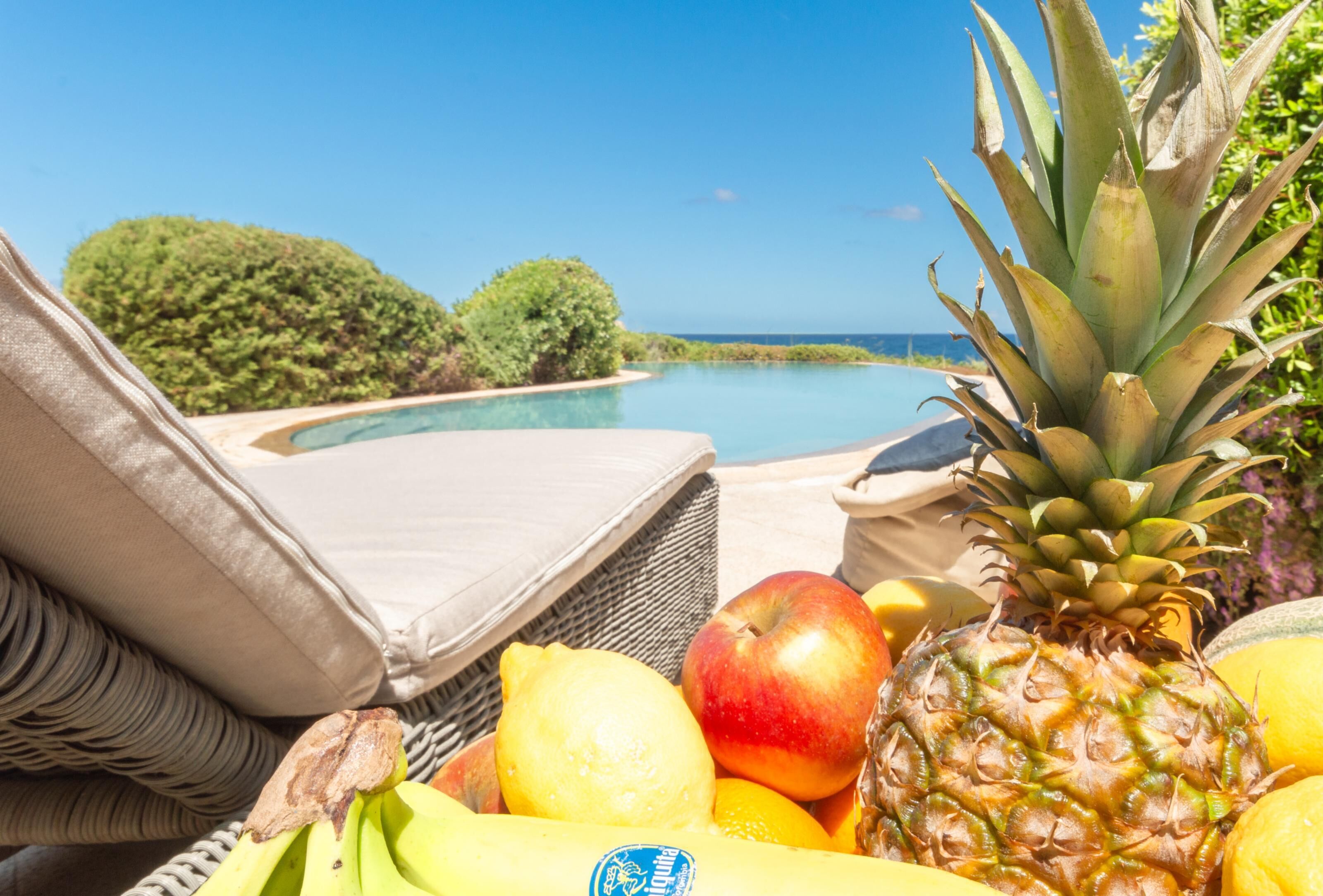 Spacious prestigious villa with exclusive pool on one level, second row from the sea, surrounded by a private garden and boasting an exceptional panoramic view. The path from the reserved parking area leads to the entrance patio, where there is a built in barbecue and an elegant outdoor dining area with a monolithic yellow granite table and a charming sea view. From the patio you can reach the rooftop solarium, where the view extends from Corsica to Asinara, or access the welcoming double living room with second dining area, fireplace and flat TV. The sea view is also visible from the living room, and even more so from the sea facing terrace with swimming pool, which separates the house from the garden. On each side of the living room are two large double bedrooms, both with en suite bathrooms and sea views. A third smaller bedroom is also available, with a French (double) foldaway bed and private bathroom. The kitchen is fully equipped with a large refrigerator and induction hob.
