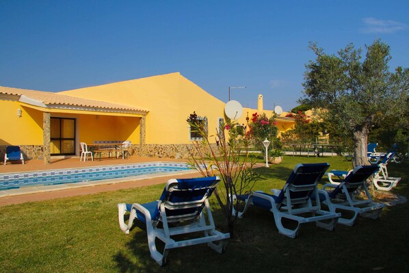 Cette máson climatisée comprende 3 chambres doubles, 2 chambres lits jumeaux et 5 salles de bains. Le salon est équipé d'une télévision a la pantalla plat, d'une cheminée, d'un coin repas et de canapés. Après avoir bronzé tout l'après midi près de la piscine, utiliser la Salle pourrez vous de jouer au jeux et au Billard o una mesa de tenis.