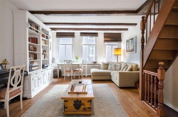 1) Los huéspedes alquilan toda la casa. Esto es extremadamente raro en Amsterdam: la mayoría de las casas del canal se han dividido en varios apartamentos más pequeños. Hay 2 dormitorios, 2 salas de estar (una se puede usar como un tercer dormitorio), un gran comedor, una espaciosa cocina de chef, 2 baños, una lavandería, un pintoresco patio y más. Sótano está excluido.