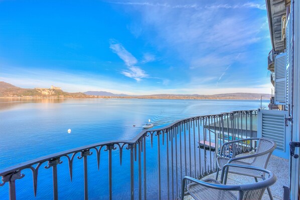 This beautiful apartment, La Dolce Vita Pied dans l\'Eau really does offer \"the sweet life\"! On the first floor of a historic building, La Dimorra dell\'Antico Porto, it nestles between the shores of Lake Maggiore and the oldest square in Arona, the Piazza del Popolo. The location is steeped in history, with the 14th-century harbour next door and a charming little church opposite which dates from 1592. The building\'s 16th century arches and wrought iron balconies are decorated with the coat of arms of the Borromeo family, just adding to its appeal.