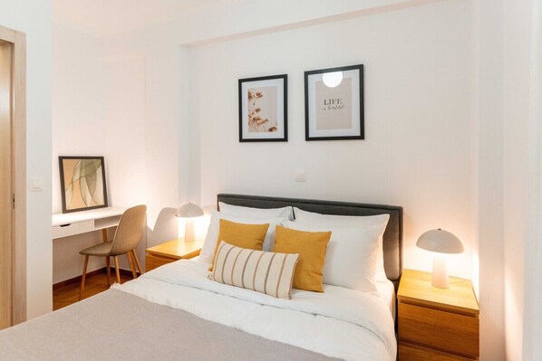The bedroom is bright and tastefully decorated in earthy hues, offering an oasis of calm and relaxation. It features a luxurious queen-size bed, ample wardrobe space, and a chest of drawers, ensuring both comfort and practicality.