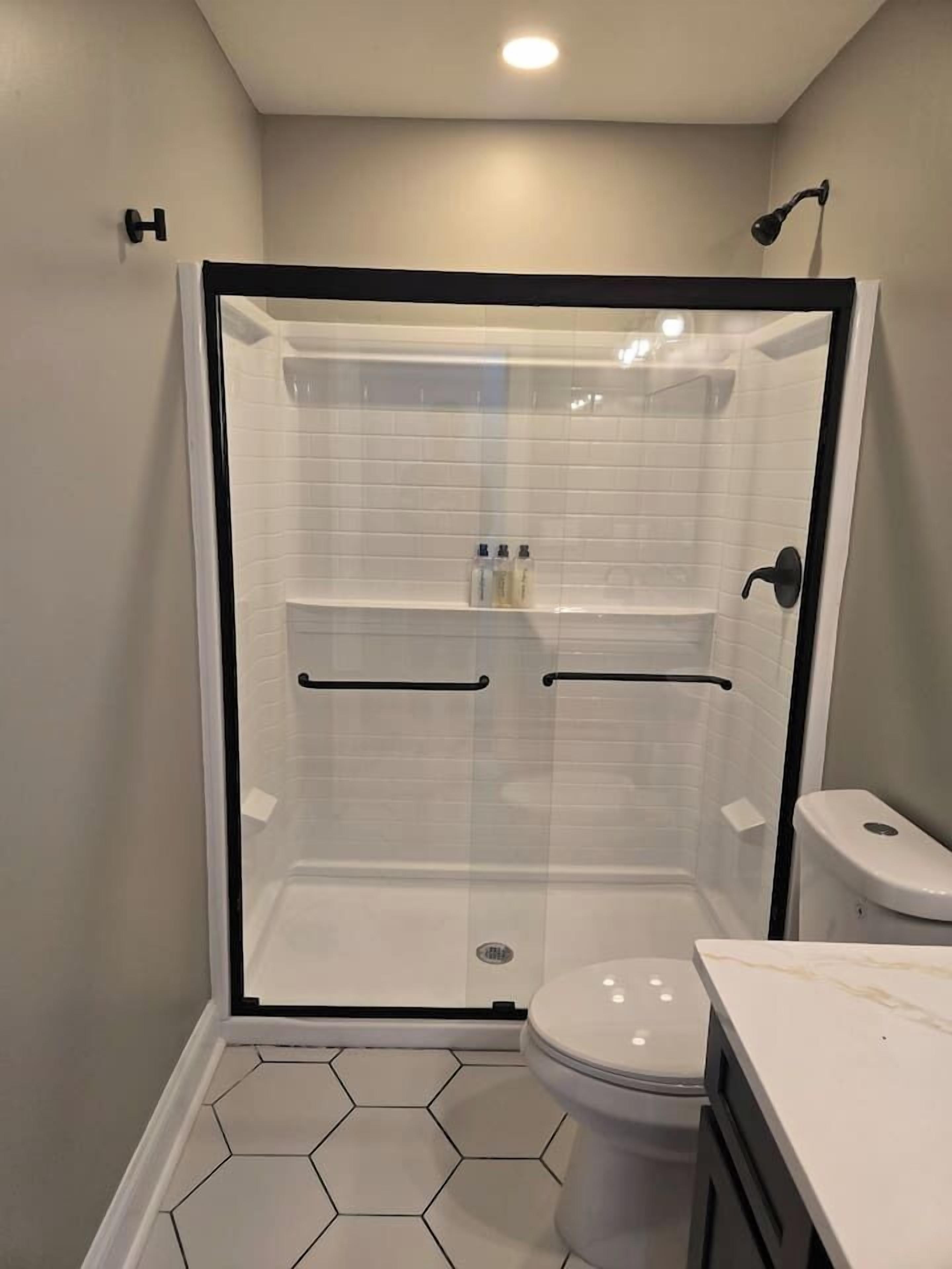 BATHROOM: shower, sink, towels, hair dryer, soap, shampoo, conditioner, and upflush toilet system
