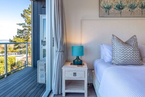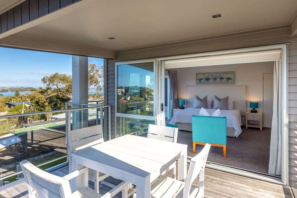 Bella Seven is on two levels. Upstairs features the large master bedroom with ensuite, extensive views, walk-in-robe and private spacious deck with table and chairs. The second bedroom has a queen bed and two king singles plus there is a separate bathroom on this level. A second lounge is at the top of the stairs complete with a wall-mounted flat screen TV and a sofa bed which converts into a double bed.