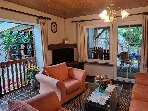 1 sala de estar con estufa de chimenea y muchos libros, CD, TV de pantalla plana,