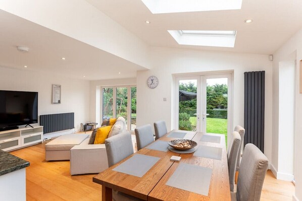 As you walk through the front door, you are immediately drawn to the high ceilings. The open plan living and dining area is the centrepiece of the house with the light flooding it all day from the skylights and large windows throughout. The kitchen here has everything you need to cook up a storm and make yourselves at home to fully enjoy your time here. Coupled with a 70` TV to kick back and relax in front of after a long day`s exploring all that the local area has to offer, this is the ideal place to spend a few days to re-charge and connect with friends or family.
