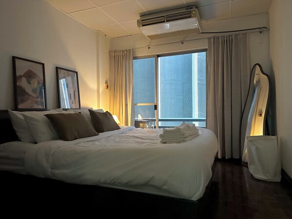 This place is a 1 bedroom apartment with an actual office. The apartment comes with a king sized bed and fully equipped with everyday living amenities such as essential toiletries, towels, basic cooking equipment, basic cleaning tools, and high-speed Wi-Fi etc. perfect for a long stay.