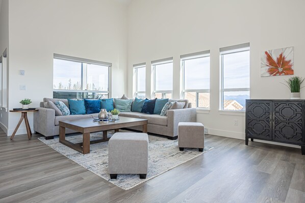 Soak into the brand new, private hot tub after a day on the slopes and cook up gourmet dinners in the large, open kitchen offering quartz counters and stainless steel appliances. There is room for everyone for those big family breakfasts at the large dining table.