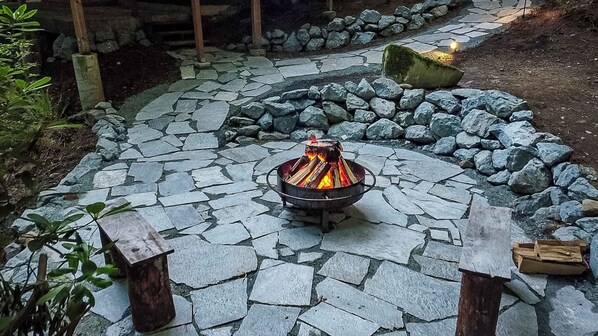There is a large deck and a covered hot tub (we didn't use it). The fire pit was relaxing, and there was plenty of dry firewood. There are two small wood benches by the fire pit (no chairs).