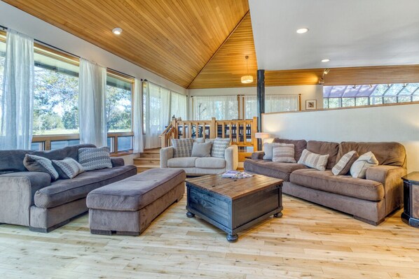 El piso principal de esta casa de 2 pisos cuenta con un plano de planta abierto con cocina, comedor y sala de estar hundida. También abajo hay un King Master y un ala separada con un dormitorio Queen, una litera de 4 camas perfecta para niños y un baño compartido. Una lavadora y secadora nuevas se encuentran en el armario del pasillo de esta ala. Subiendo una amplia escalera se encuentra el King Master Loft, un exclusivo "dormitorio abierto" que da a la sala de estar. Debido a que no está completamente cerrado, puede que no sea la mejor opción para personas que duermen poco, sin embargo, su diseño espacioso y su baño encantador lo convierten en el área de descanso más codiciada de la casa. Al otro lado del hermoso corredor cubierto hay una casa de huéspedes independiente con cama queen, cocina americana y baño privado.