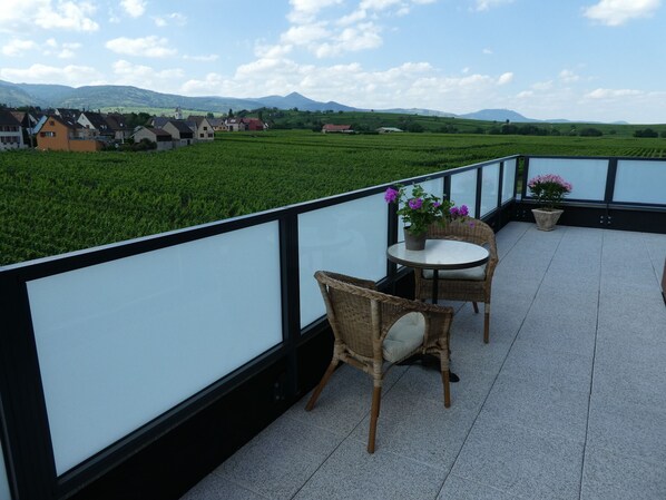 Apartamento de 2 habitaciones de 51 m2 en una pequeña residencia nueva con ascensor (finalización de obras en abril de 2017). Compuesto por una cocina abierta a la sala de estar con vista panorámica, 1 dormitorio independiente, 1 baño separado con 2 lavabos y una ducha a ras de suelo. Tiene capacidad para 2 personas en un ambiente confortable y relajante. El alojamiento del ático (planta superior), totalmente equipado con nuevo, tiene una gran terraza privada de 32 m2 en ángulo, que ofrece impresionantes vistas de los viñedos y castillos de Alsacia, incluido el no menos famoso * Haut-Koenigsbourg *