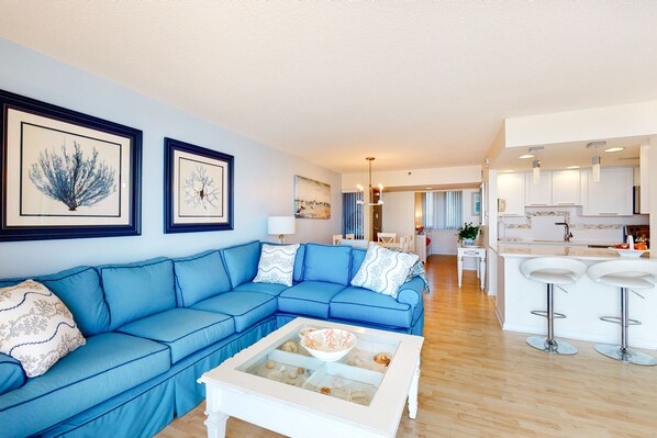 Overlook the surf and sand from the balcony of this updated sixth floor 2-bedroom (and private den), 2-bath oceanfront condo! A convenient one-level layout, this single story surfside featuring a living and dining area, well-equipped kitchen, den, full hallway bathroom and two bedrooms, including the master suite. Accessible without stairs. Central air conditioning, washer, dryer and more. 3 TVs, 2 DVDs, Blu-ray, Wifi.