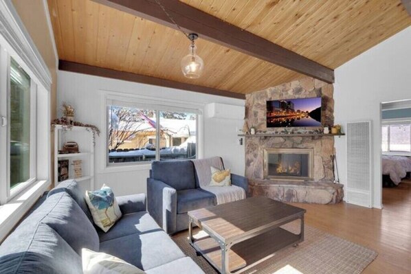 Escape to our cozy mountain cabin, where you can unwind in the hot tub, gather around the fire pit, and enjoy a BBQ in the fully fenced backyard. Inside, vaulted ceilings create a spacious feel, while the warm wood-burning fireplace adds to the charm. The kitchen is fully stocked with everything you need to cook meals, and we provide dinner trays for a relaxed dining experience. Two comfy bedrooms, plus a pull-out couch, make this cabin perfect for family getaways!