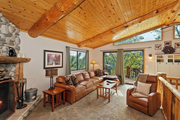 Cabeza arriba a la sala de estar de planta abierta, vistas a las pistas, techo abovedado de madera de pino, madera de piedra natural de la chimenea, sofá de cuero y TV con cable y reproductor de Blu-Ray quema. La cocina está a solo unos pasos e incluye mostradores de granito, cocina de gas, microondas, lavaplatos y cafetera tradicional. Paso por la terraza y disfrutar de sumergirse en la bañera caliente, asar en la barbacoa de gas propano o simplemente relajarse en la sombra. Un 3/4 baño también está en el nivel superior con ducha de esquina y un fregadero separados, conveniente para el uso compartido.