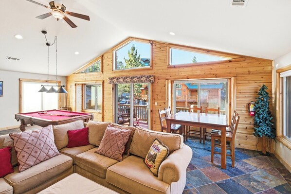 La sala de juegos del nivel superior es perfecta para reunirse con un bar, mesa de billar, sofá-L, TV con cable, chimenea de leña y una pequeña cubierta frontal. Una pequeña sala de estar con vista a la sala de estar de abajo y la sala de juegos es el lugar perfecto para acurrucarse con su libro favorito. El nivel superior también incluye tres dormitorios. El primer dormitorio tiene una cama king size, TV inteligente y ventilador de techo. El segundo dormitorio tiene una cama king size, TV inteligente, ventilador de techo y acceso a una cubierta trasera. El tercer dormitorio tiene una cama queen, dos camas individuales en litera completa, TV con reproductor de DVD y acceso a la cubierta trasera.