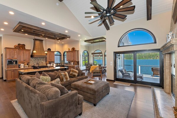 La gran cocina de concepto abierto tiene todas las comodidades que necesitará. Con un amplio espacio en el mostrador y una isla central, con su propio fregadero es una excelente área de preparación de comidas. Hay un horno de doble pared, encimera de gas, microondas, horno tostador y lavavajillas. Hay una despensa y un lavabo doble con dos grandes ventanas en arco, que ofrecen vistas al lago. Hay una cafetera estándar, horno tostador, olla eléctrica y olla a presión.