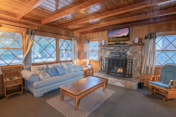 LIVING SPACE - Cozy 800+ sq ft home with living room, TV, ceiling fans, dining table, bar seating, a beautiful wood burning fireplace, and plenty of comfortable living room seating.