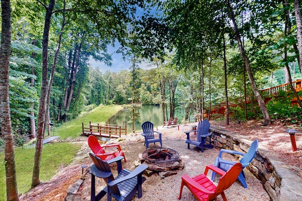Simply Devine at Water's Edge is situated on a stunning, spring-fed lake teeming with fish, turtles, and more. Enjoy fishing with the provided poles and fish food or relax on the water with our floats. The lake area features a new, deluxe six-person hot tub on the lower deck, offering a serene mountain and lake view. The hot tub is drained and sanitized after each rental for your peace of mind. End your day with a stroll down the lit path to the lakeside fire pit. Enjoy the starry sky, make s’mores, and relax in Adirondack chairs while listening to nature’s symphony.