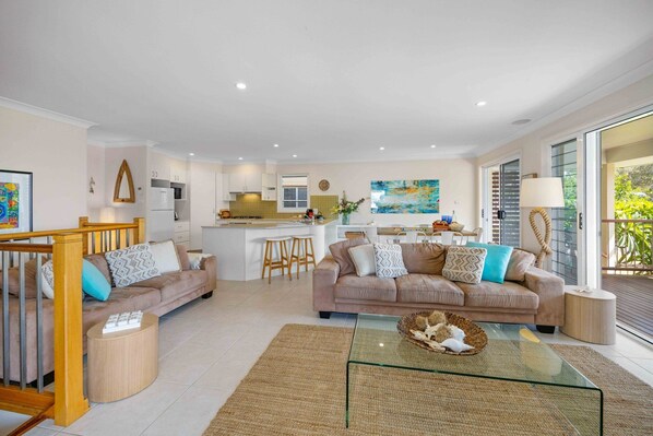 Modern two storey home. Open plan living. Two lounges. Dream kitchen, gas stove, Nespresso coffee machine. Free Wi-FI, smart TV, linen and beach towels.
