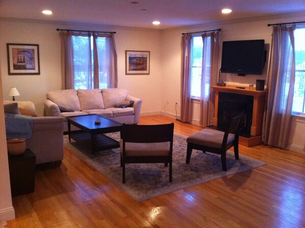 Disfrute de un café matutino o un cóctel nocturno desde el entrepiso y la terraza con vista a Marblehead con una hermosa vista de Abbot Hall. El entrepiso tiene una barra húmeda y un refrigerador para su conveniencia.
