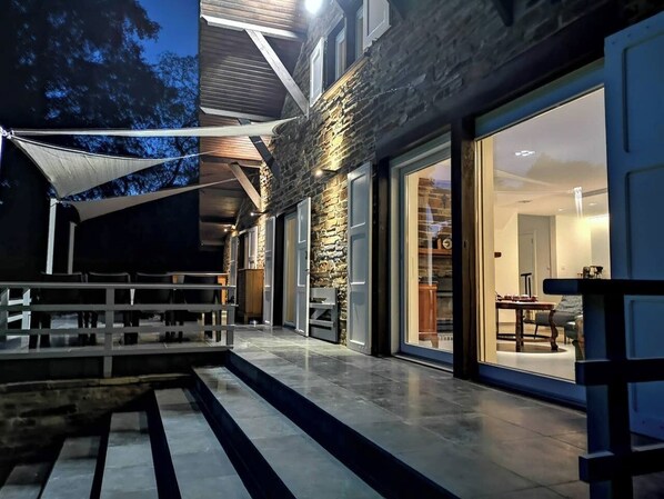 In summer, relax on the spacious terrace overlooking the river. In winter, unwind by the fireplace in the cozy living room, the river is visible from the dining area and even from the main suite. At night, the subtle lighting along the Semois creates a magical riverside atmosphere.