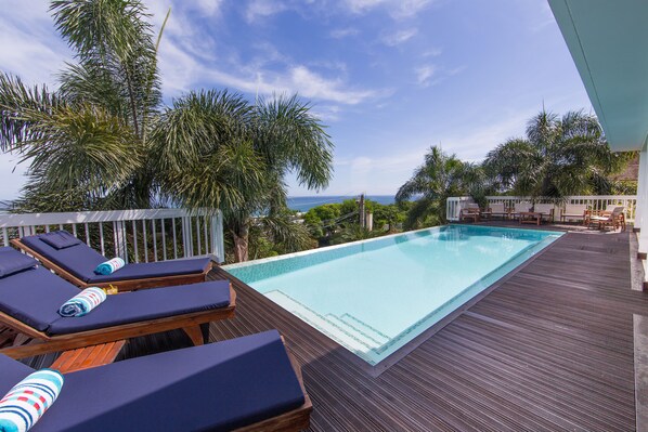 Una hermosa villa de 4 dormitorios que se abre a una hermosa terraza de madera con una piscina infinita con vistas panorámicas al mar Caribe.