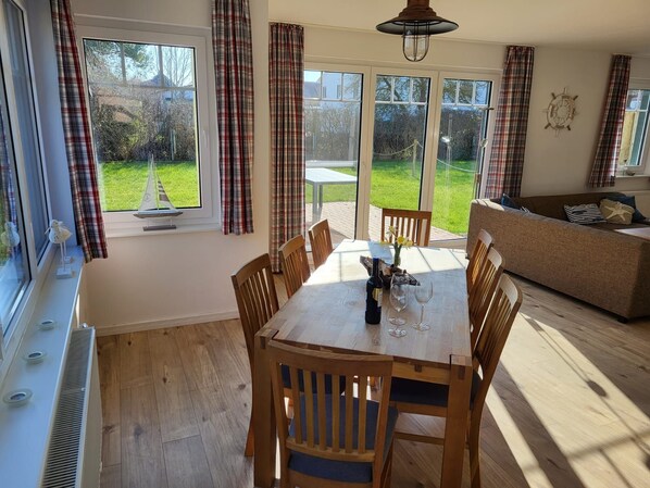 - casa de vacaciones media completa con propiedad propia - 2 dormitorios cada uno con una cama doble de 1,80 m, 1 dormitorio con 2 camas individuales, 1 dormitorio en un altillo con 2 camas individuales - abierto a la escalera!- 2 cuartos de ducha (uno con sauna - incluido en el precio) - estufa de leña con una cesta de madera incluida. El equipamiento de la casa en un estilo moderno de casa de campo es muy exclusivo. Características especiales de la casa de vacaciones utilizable hasta 8 personas u. a. Una propiedad privada, estufa de leña, sauna, radiador de toallas y calefacción por suelo radiante en los baños. 120 m² de espacio habitable, 320 m² de propiedad propia - hasta 8 personas por casa - 2 estacionamientos - 2 cuartos de baño con ducha de vidrio real, inodoro, tocador, el baño en la CE también está equipado con una sauna finlandesa para 4 personas ( incluido) - Amplio salón-comedor: mesa de comedor con 8 sillas, un acogedor sofá esquinero, TV satelital de 43 pulgadas, radio, mosquitero en la puerta del patio, estufa (1 bolsa de madera incluida) - cocina bien equipada, amplia con lavavajillas, estufa con 4 platos, Horno, refrigerador incl. Congelador, cafetera, hervidor, tostadora, vasos de alta calidad, cubiertos, etc. - 2 habitaciones con cama doble, 1,80 m y armario, ventana con repelente de insectos, posibilidad de apagón - 1 habitación con 2 camas individuales y armario, posibilidad de oscurecimiento - 1 galería para dormir en el desván con excelentes vistas (abierto al corredor) con 2 camas individuales - Terraza: mesa con 8 sillas, barbacoa, iluminación - Internet a través de W-LAN incluido - Por trona por casa incluye 1 cuna y 1 cuna de viaje