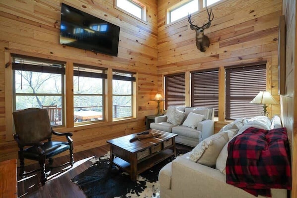The living room is designed to bring everyone together with classic cabin decor, and comfortable couches in front of the flat-screen TV. The large windows is a focal point of the room and adds a warm glow to the space on cool evenings. The living room is surrounded by windows and gets a lot of sunshine in the afternoons with amazing views of the creek.