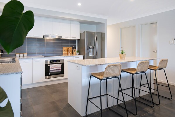 The kitchen centres around a spacious island with stool seating, making it easy to gather for quick breakfasts or casual conversation, while modern appliances and generous bench space support effortless cooking. Meals can be shared outdoors on the undercover patio, where a ceiling fan and comfortable dining create an easy setting for alfresco moments. Beyond, the private backyard offers an expansive lawn and outdoor seating—ideal for quiet downtime or giving the kids space to enjoy the sunny outdoors.