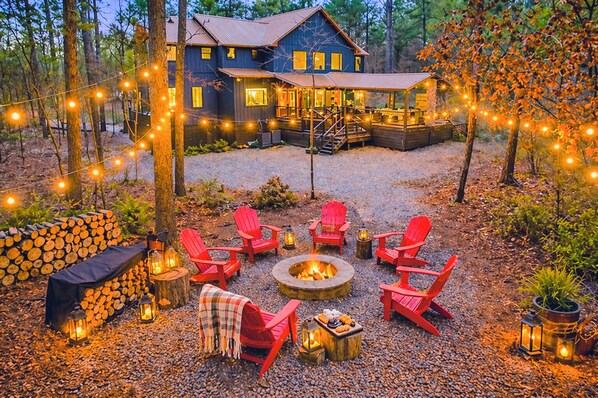 The outdoor experience is where this cabin truly shines. Relax in the private hot tub under the stars, gather around the firepit, enjoy the outdoor fireplace (seasonal May–September off), or watch a game on the outdoor TV. The large deck also features a gas grill, giant Connect Four, axe throwing area, and a playset for kids. A circular driveway provides ample parking for multiple vehicles, boats, and ATVs.
