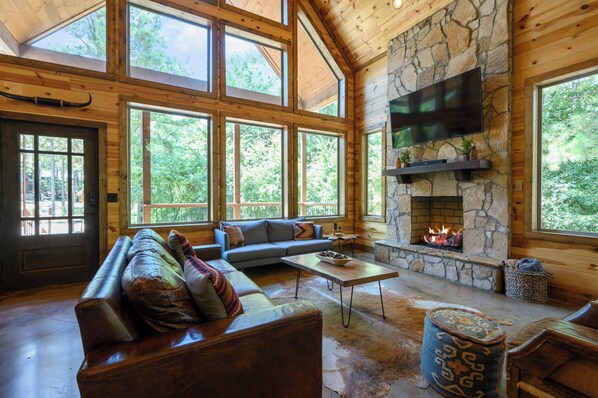El primer piso de la cabaña cuenta con un plano de planta abierto en las áreas de cocina, comedor y sala de estar, ideal para interactuar con sus seres queridos. El alto techo abovedado permite que la hermosa luz natural fluya desde la enorme pared de ventanas en cada extremo de la cabina. Este amplio espacio de planta abierta alberga una hermosa chimenea de gas, una gran TV inteligente de 65 pulgadas, un comedor y una cocina con una nevera para vinos de ocho botellas. Un medio baño fuera de las habitaciones completa el salón. Dos habitaciones principales están ubicadas en el primer piso, cada una con colchones queen Purple® y sus propios baños adjuntos con duchas empedradas.
