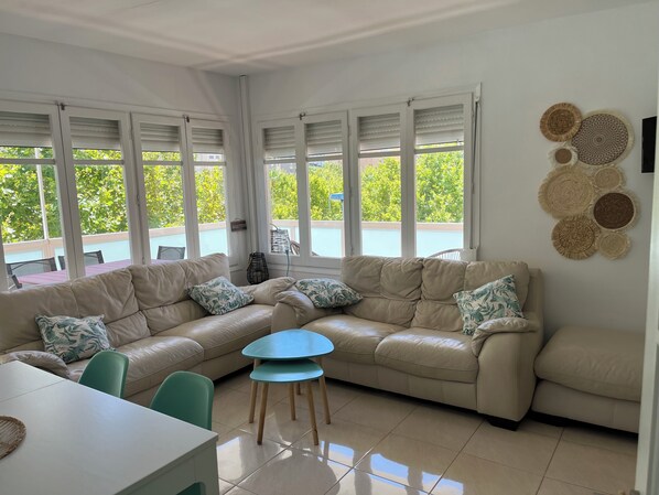 El apartamento dispone de 2 habitaciones (2 camas dobles), cocina equipada abierta al salón, baño , aire acondicionado, lavadora, tostadora, sillas de playa, plancha, secador de pelo, horno. Eléctrico, mosquitera, ropa de cama y ducha incluido en el alquiler. Cuna disponible bajo petición. Terraza alrededor del apartamento con mesa y sillas.