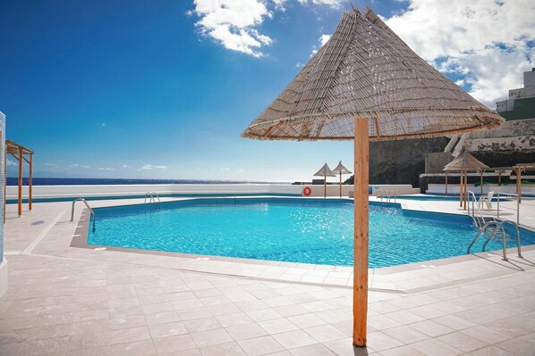 Entre sus características destacadas, encontrarás una terraza con mobiliario de jardín, una entrada privada, y un balcón que te invita a disfrutar del aire fresco y las vistas. Tendrás acceso a una refrescante piscina de agua salada compartida, perfecta para darte un chapuzón. El apartamento también ofrece WiFi gratuito y TV con canales en español e inglés. Para tu tranquilidad, cuenta con detector de humo y botiquín de primeros auxilios, además de una zona para tender la ropa.
