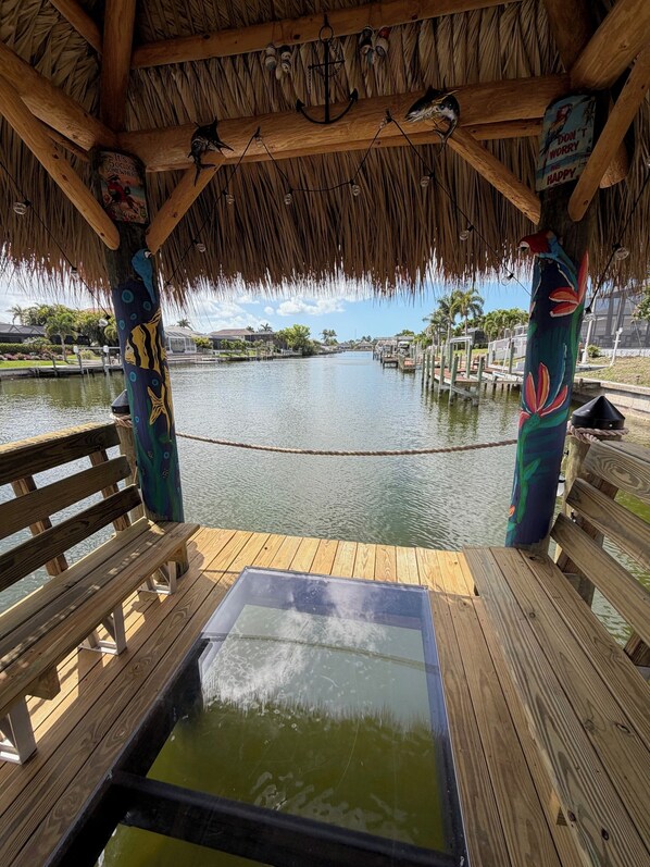 • Fish directly from the dock - Fishing poles and tackle box in the garage - underwater fish light that attracts fish • Weber gas grill (extra propane provided) • Outdoor dining for 6 • Adirondack seating • Wall-mounted Smart TV on lanai + 2 ceiling fans • Pool toys, pool basketball & life-size Connect Four • Lighted pathway to front entrance and stairs are lighted going down to dock area