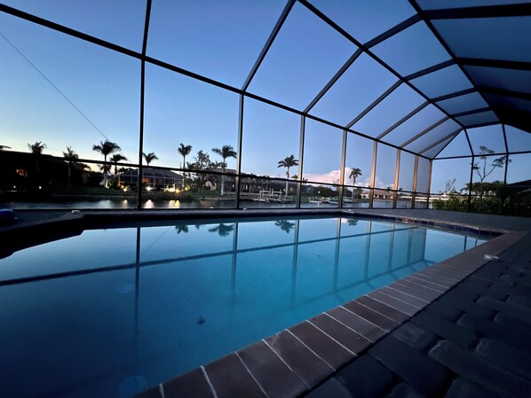 The home office is ready for you if you need to check in on work or business. The patio area including the pool is protected by a cage to keep out leaves, grass and insects. One of the bathrooms is directly accessible from the pool area. The terrace is equipped with a covered dining area, and you can enjoy a meal next to your private pool with the palm trees, canals and beautiful sunset as a backdrop.