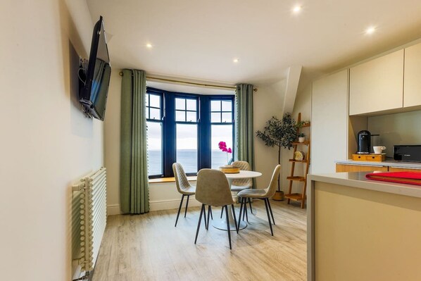 Enjoy a luxurious stay in this beautifully designed studio, perfect for relaxing by the coast. The space features a comfortable king-size bed, a stylish living area, and stunning sea views that can be enjoyed throughout your stay. The open-plan layout includes a modern, state-of-the-art kitchen fully equipped for cooking, along with a cosy seating area and Smart TV for unwinding after a day out. Large windows fill the room with natural light while showcasing the gorgeous coastal scenery. Fresh linen and towels are provided, and the space is thoughtfully finished to a high standard, offering both comfort and style. Ideal for couples or solo travellers looking for a peaceful seaside escape.