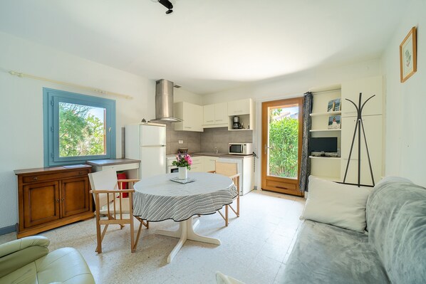 - Open-plan kitchen equipped with oven, microwave, toaster, dishwasher, hob, etc.
