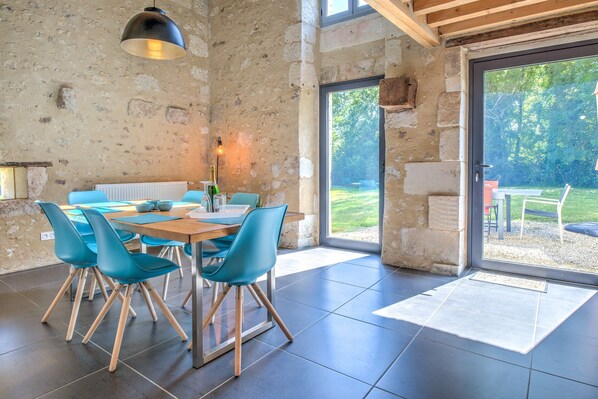 La Moulinasse es una antigua finca cerca de Ribérac y Aubeterre, restaurada en modernos gîtes con encanto rural. Les Chouettes es un gîte amplio para 4 personas junto al estanque. Dispone de salón con cocina y comedor en la planta baja, zona de estar en la entreplanta, baño con ducha y lavabo, aseo independiente, un dormitorio con cama doble y otro con 2 camas individuales bajo la estructura original. Contáis con Wi-Fi, cocina equipada (placa eléctrica, horno, nevera, lavavajillas, microondas, cafetera), TV con reproductor DVD (sin canales), terraza amueblada y barbacoa. Sábanas y toallas incluidas. Cuna y trona disponibles bajo petición.