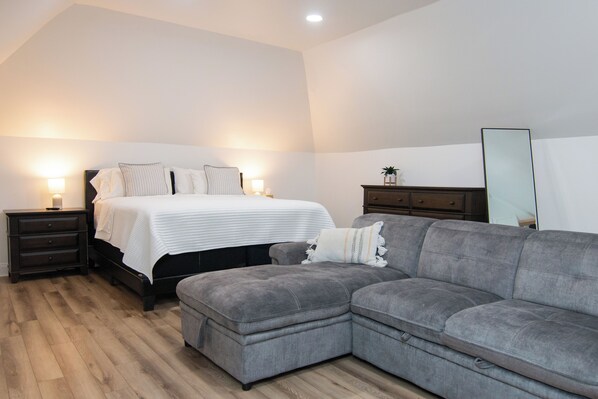 This space was probably just an attic when the house was built in the mid 1940’s- it’s anything but an attic now. This newly renovated studio apartment houses a king size bed as well as a double sofa sleeper. The table comfortably seats 4 guests for dining, and our work station allows for distraction free work if you must. While the primary residence is a local family home, the Loft is a completely separate space you will access from the alley behind the home.