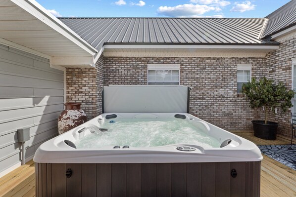Outdoor hot tub with the soothing sounds of a nearby waterfall and goldfish pond