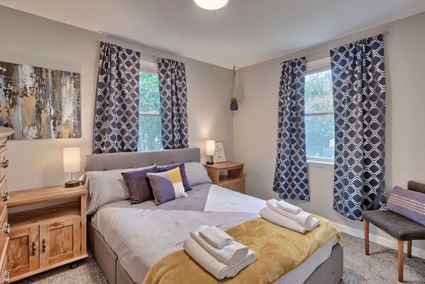 Queen BEDROOM: Across the hall, there is also a Queen bedroom complete with a comfy platform bed, nightstands, and dresser featuring navy/yellow new furnishings and room darkening curtains!
