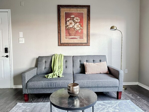 Enjoy a comfortable and well-equipped stay in this modern 1-bedroom apartment, offering everything you need for a relaxing and hassle-free experience. The space is fully furnished with all the essentials, including quality amenities and toiletries to make your stay enjoyable. The apartment includes a cozy living room, a functional kitchen, a comfortable bedroom, and a clean, well-maintained bathroom. For added convenience, the living room also features a futon, perfect for extra sleeping space. It’s the perfect choice for a practical and pleasant stay.