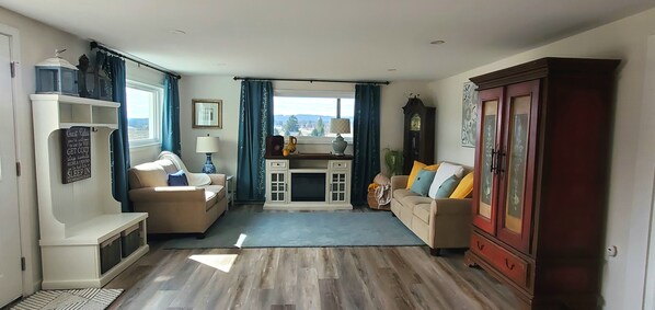 The apartment and the view are both stunning! The square feet of the bedrooms and living spaces are generous and well laid out. Even the half bath off of the living space was nicely sized. There was a cozy outdoor space overlooking the sweeping views that my daughter particularly enjoyed. And, the folks who selected the interior decor understood the assignment! It was the perfect balance of elegance and simplicity, down to every end table, ornament, armoire, etc. Most of the pieces are antiques that draw the eye and calm the mind. Most impressively, our host Celeste was the perfect balance of welcoming and available, as well as respectful of our privacy. She thought through details like having phone chargers on the living room unit, a welcome sign with my name greeting me by the kitchen, freshly laid chicken eggs and artisanal pastries, an invitation (which we took her up on) for my daughter to see the chickens. Also of note was that we felt very secure with the security of our unit (I have not always felt that way at other places I’ve stayed over the years, believe me!) We were supremely happy with our stay!