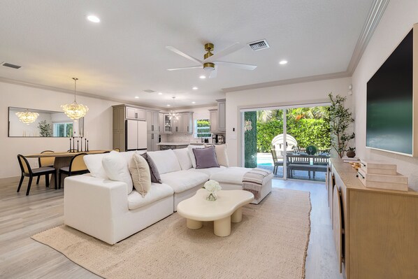 Step inside to a bright, open floor plan perfect for family gatherings or group retreats. Main level features a brand-new kitchen with quartz countertops, stainless appliances, and everything you need to cook and entertain. The plush coastal-inspired living room offers ample seating and a 75-inch Frame Smart TV, ideal for movie nights or relaxing after a day at the beach.