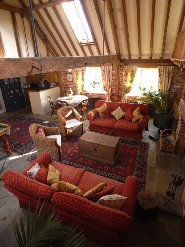 Maderas antiguas, hermoso ladrillo, un techo abovedado, viejas alfombras persas en un suelo de piedra, cómodos sofás de cuero frente a la estufa de leña - sólo algunos de los encantos que le espera en el Granero en Logmore Farm.