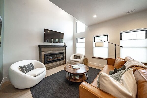 • Stylish living room with cozy gas fireplace & leather couch
