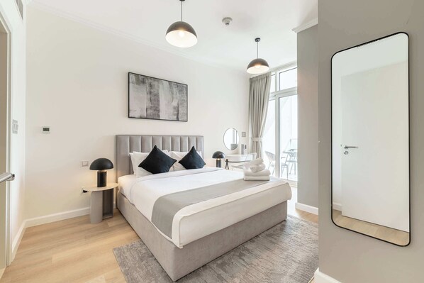 This thoughtfully designed 1-bedroom apartment features a plush king bed adorned with premium linens, flanked by sleek black modern side lamps on elegant nightstands. A versatile dresser table doubles as a workspace, catering to both leisure and productivity.