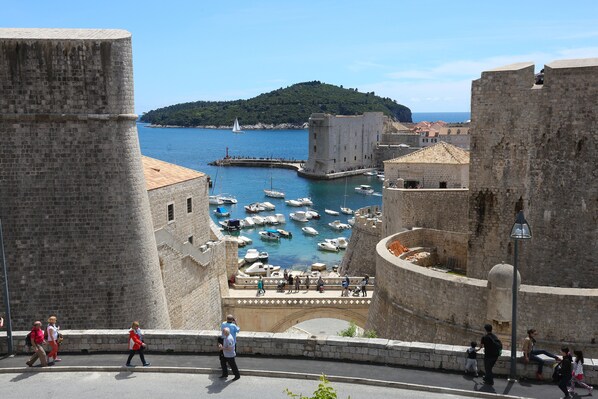 Overlooking the Adriatic Sea the two bed room home is only few steps away from Dubrovnik’s Old Town, popular Banje Beach, Cable car,shops and restaurants offering stunning view to the city walls, fortifications, stone bridge, old port, seafront and Lokrum island.