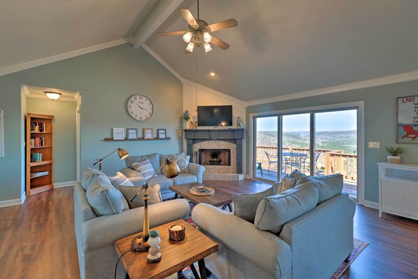 The living room features a panoramic view of the lake and valleys below. Stream your favorite shows on our smart TV, curl up on one of the three loveseats, or play board games with the whole family!