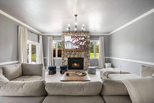 Retire to one of three luxurious bedrooms, each appointed with plush bedding for a restful night's sleep. Choose from a king bed or two queen beds, ensuring comfort for every guest. A full bathroom and a convenient half bath provide ample space for your stay.