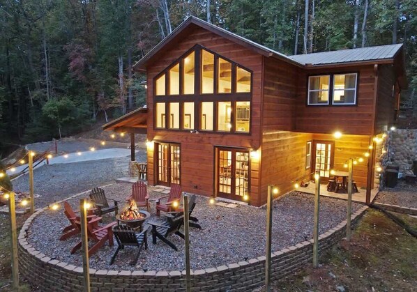 There is a small covered porch, with charcoal grill, dining table and additional seating outside the kitchen. The fire pit area is directly off the living room, has Adirondack chairs and string lights to enjoy the beautiful mountain evenings!